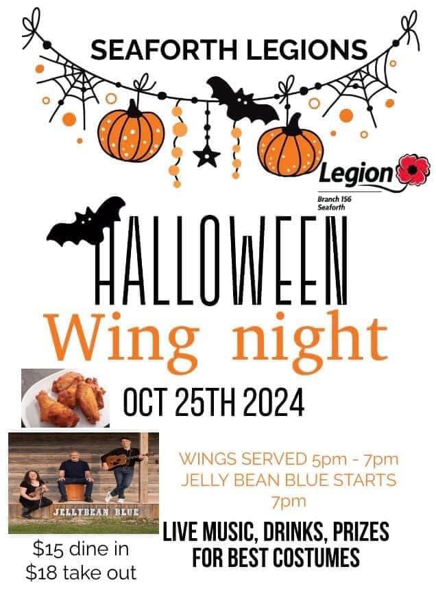 Enjoy wings and live music at the Seaforth Legion on October 25th! Wings will be served 5:00p.m. to 7:00p.m. Jelly Bean Blue starts at 7:00p.m. Tickets are $15 to dine-in and $18 for take out. Prizes will be given out for the best costumes!