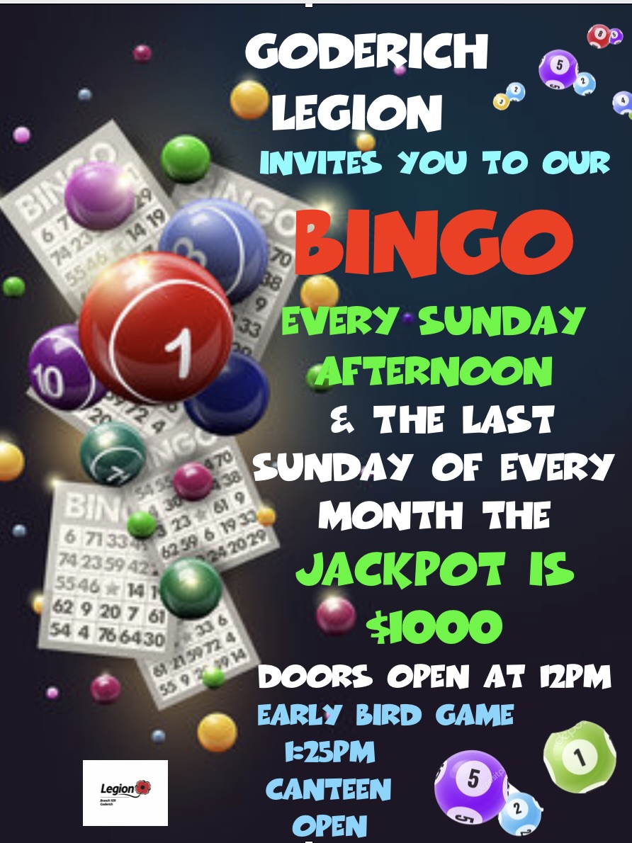 Come join us upstairs at the Goderich Legion for our legendary Bingo!