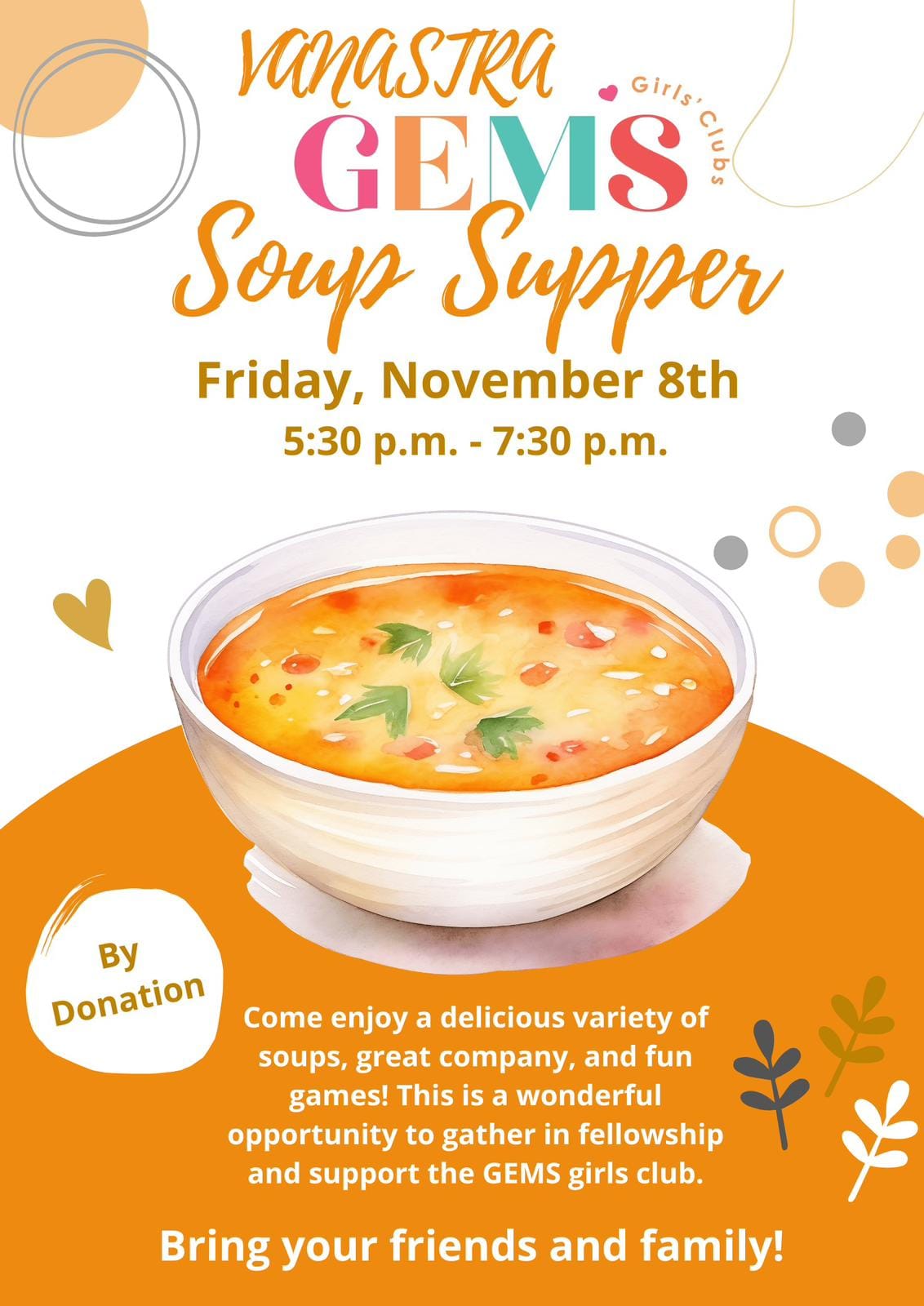 Enjoy a soup supper by donation in support of the Vanastra GEMS girls club!