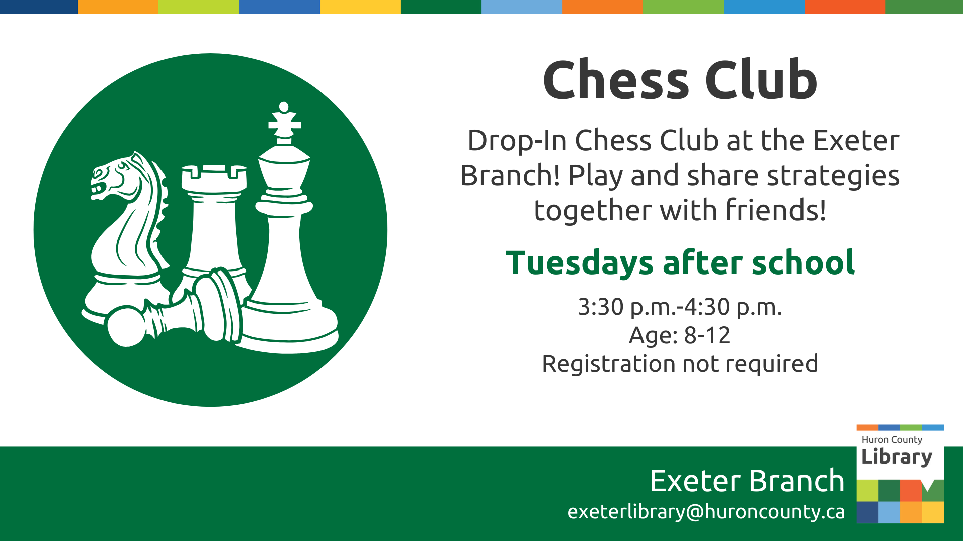 Join us Tuesdays for Drop-In Chess Club at the Exeter Library! Play and share strategies together with friends. Recommended ages 8-12. For more information, contact the Exeter Library at 519-235-1890 or exeterlibrary@huroncounty.ca