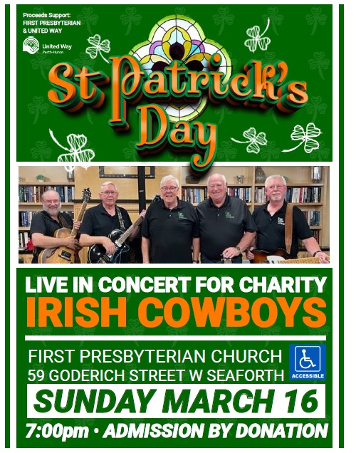 Please join us on Sunday, March 16,2025 for The Irish Cowboys in concert! Starting at 7pm, at the Seaforth First Presbyterian Church, this is an all ages concert in support of the United Way Perth Huron's planned Nourish Equal Access Market. Free will offering graciously accepted. Don't miss out on the fun!