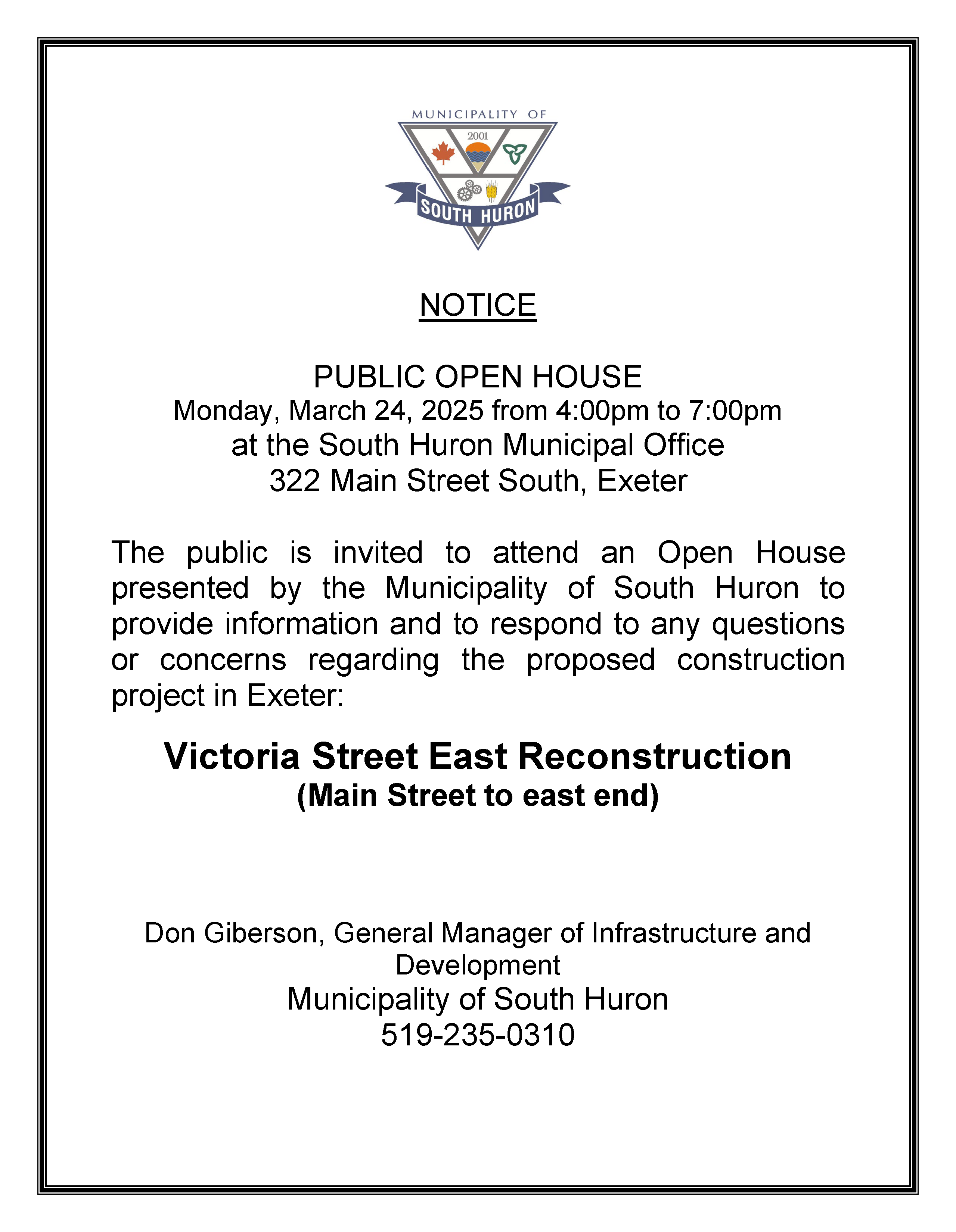 The public is invited to attend an Open House presented by the Municipality of South Huron to provide information and to respond to any questions or concerns regarding the proposed construction project in Exeter: Victoria Street East Reconstruction (Main Street to east end)