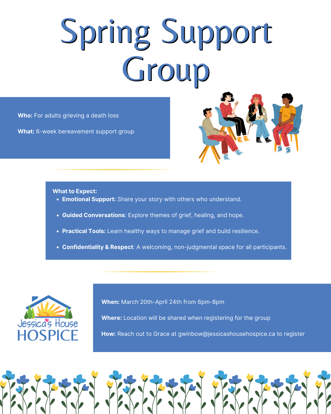 Jessica’s House Hospice is offering a Grief Support Group this Spring for adults who have experienced the death of a loved one. This six-week program provides a safe and compassionate space to share, connect, and find support alongside others who are navigating grief.
