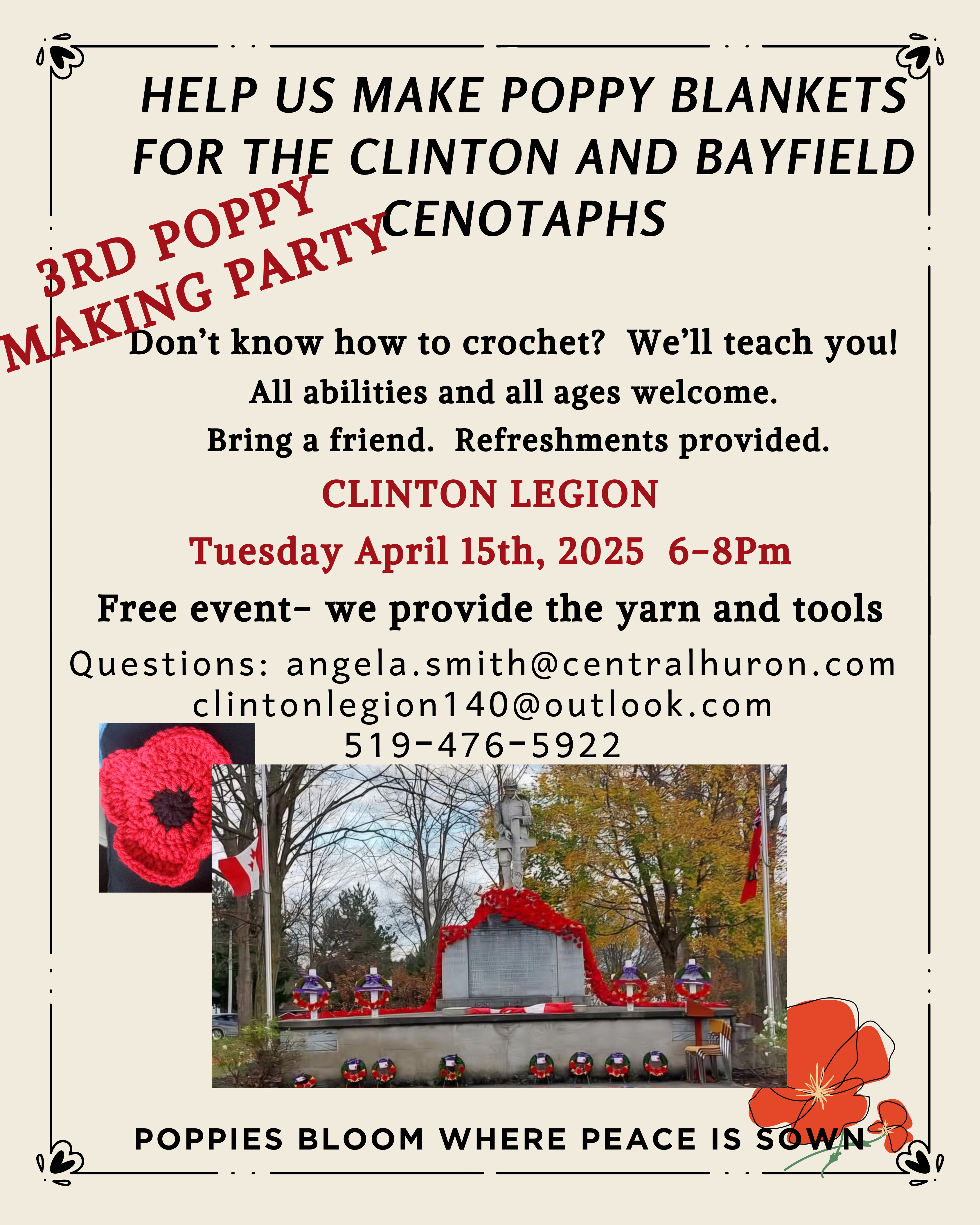 Help us make poppy blankets for the Clinton and Bayfield Cenotaphs!