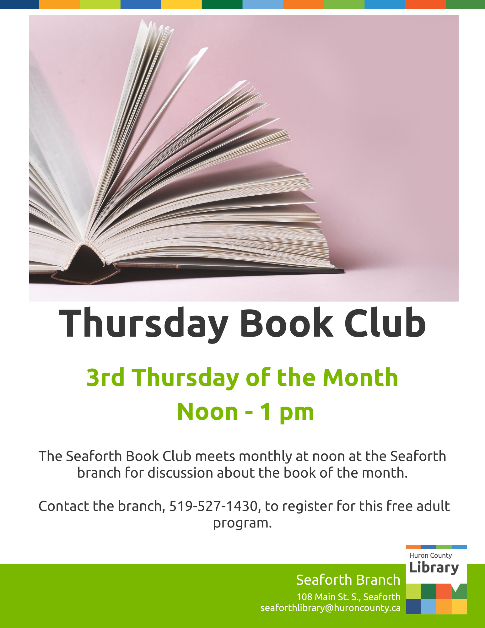 The Seaforth Book Club meets the third Thursday of the month at noon at the Seaforth branch library for discussion about the book of the month.