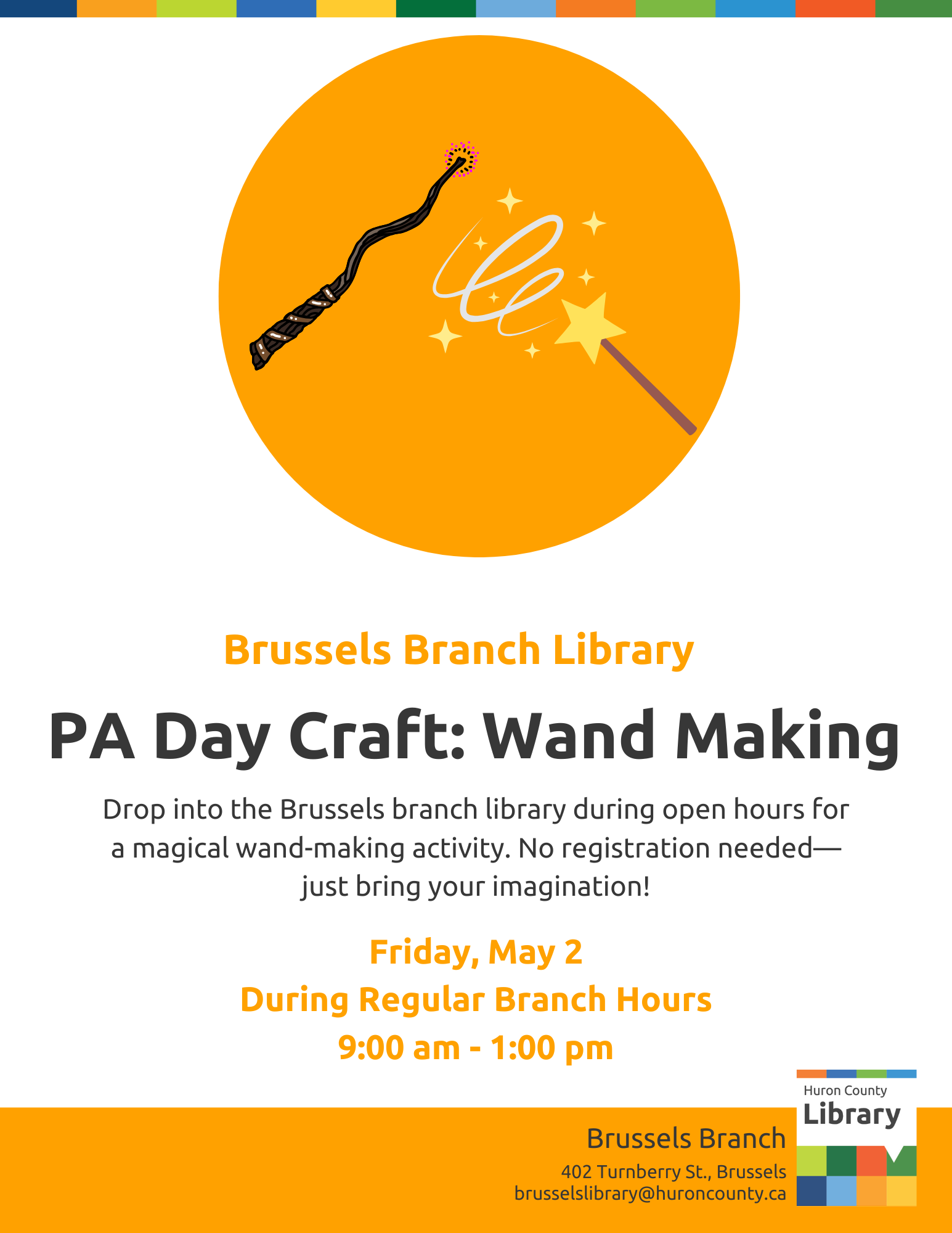 Make a wand with us! Friday May 2, PA Day drop-in craft program at the Brussels Branch Library during open hours, 9am-1pm. No registration needed - just bring your imagination!