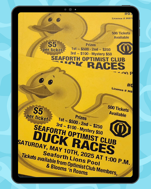 Seaforth Optimist Club Duck Races will be held at the Seaforth Lions Pool on May 10th at 1:00p.m. Only 500 tickets available! $5 per ticket. Tickets are available from Optimist Club Members and at Blooms 'n Rooms in downtown Seaforth.