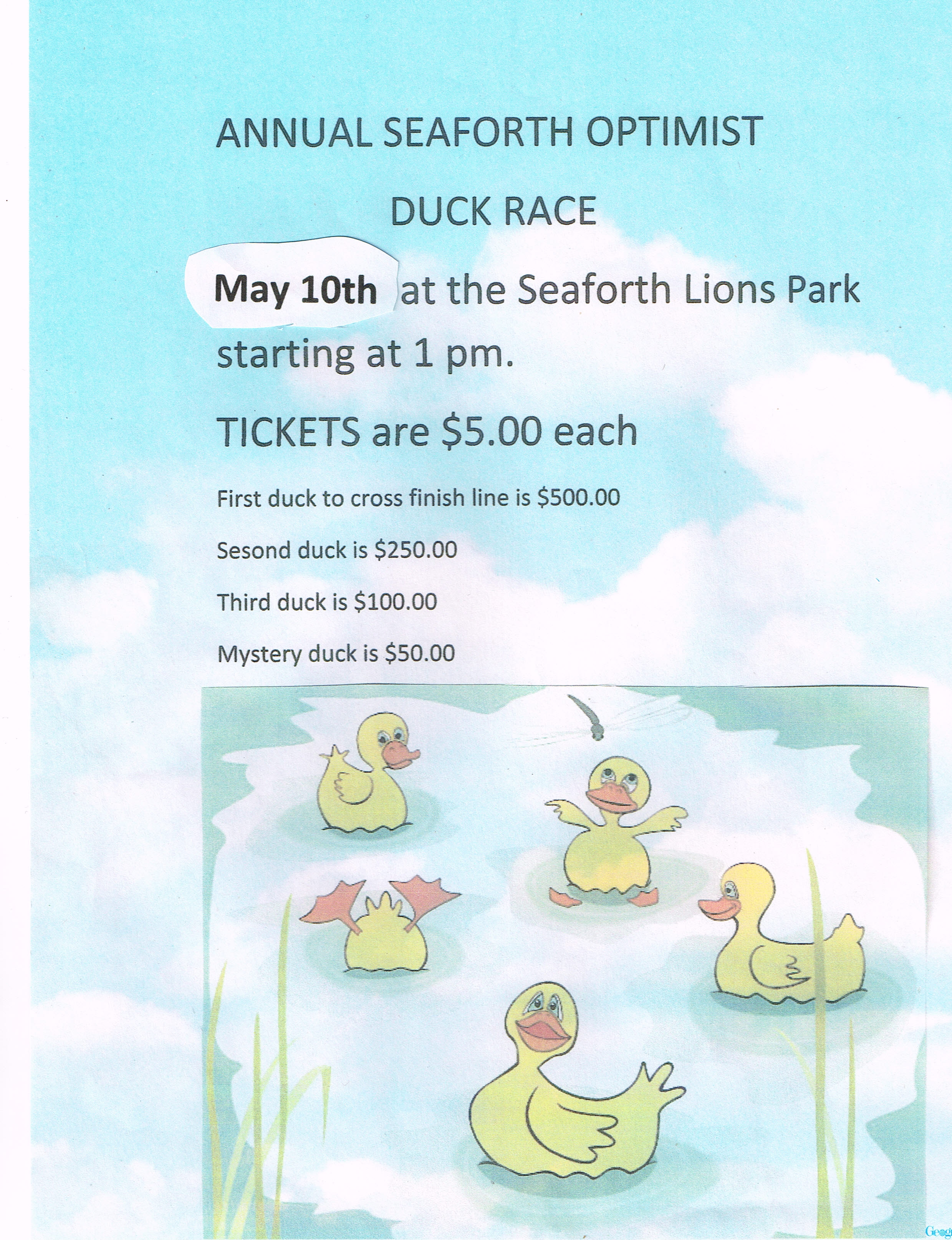 Annual Seaforth Optimist Duck Race on May 10th starting at 1:00 pm at the Seaforth Lions Park.
