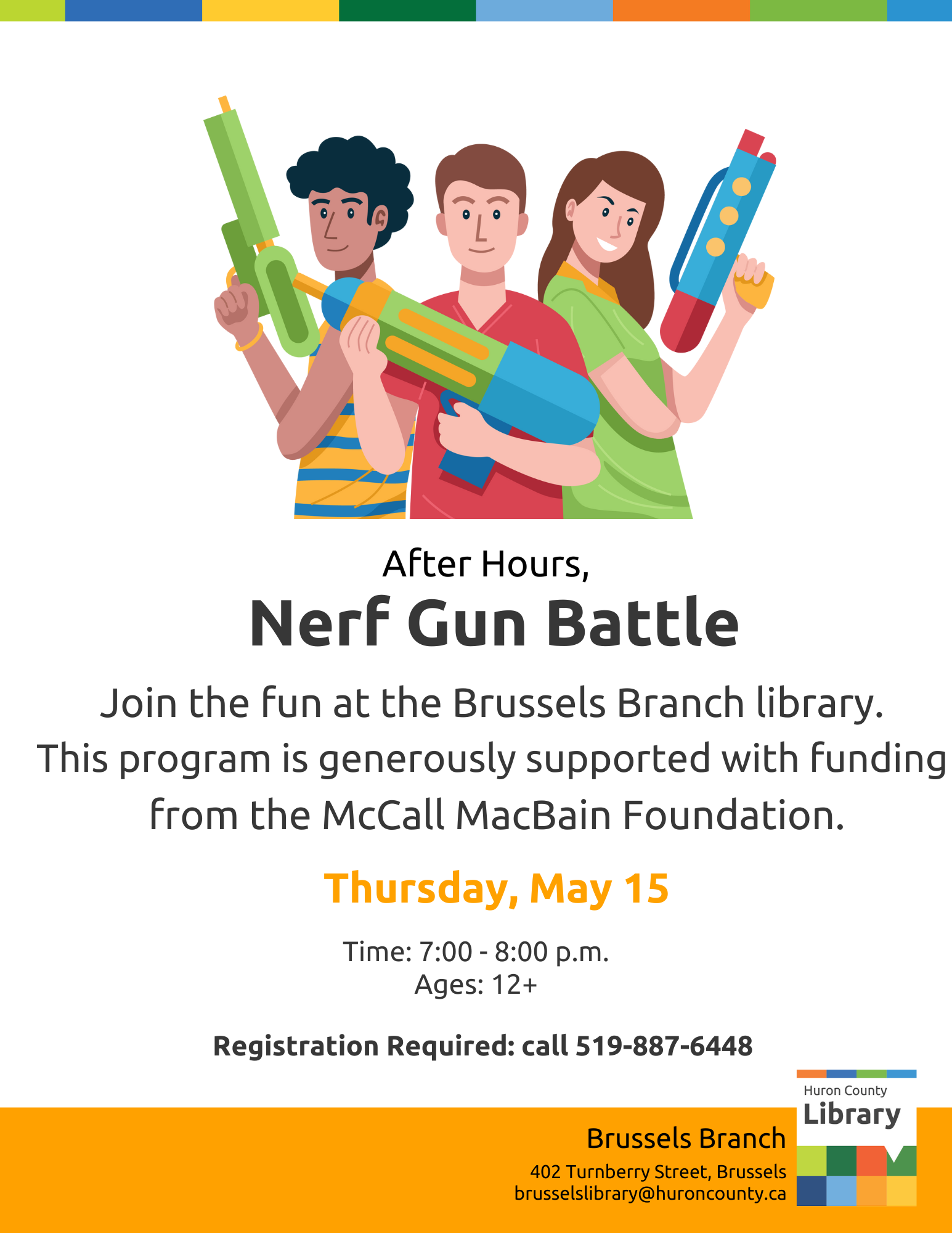 After hours NERF fun at the Brussels Branch Library. Thursday, May 15, 7-8pm. Made possible by funding from the McCall MacBain Foundation. Ages 12+. Register by calling 519-887-6448, or email brusselslibrary@huroncounty.ca