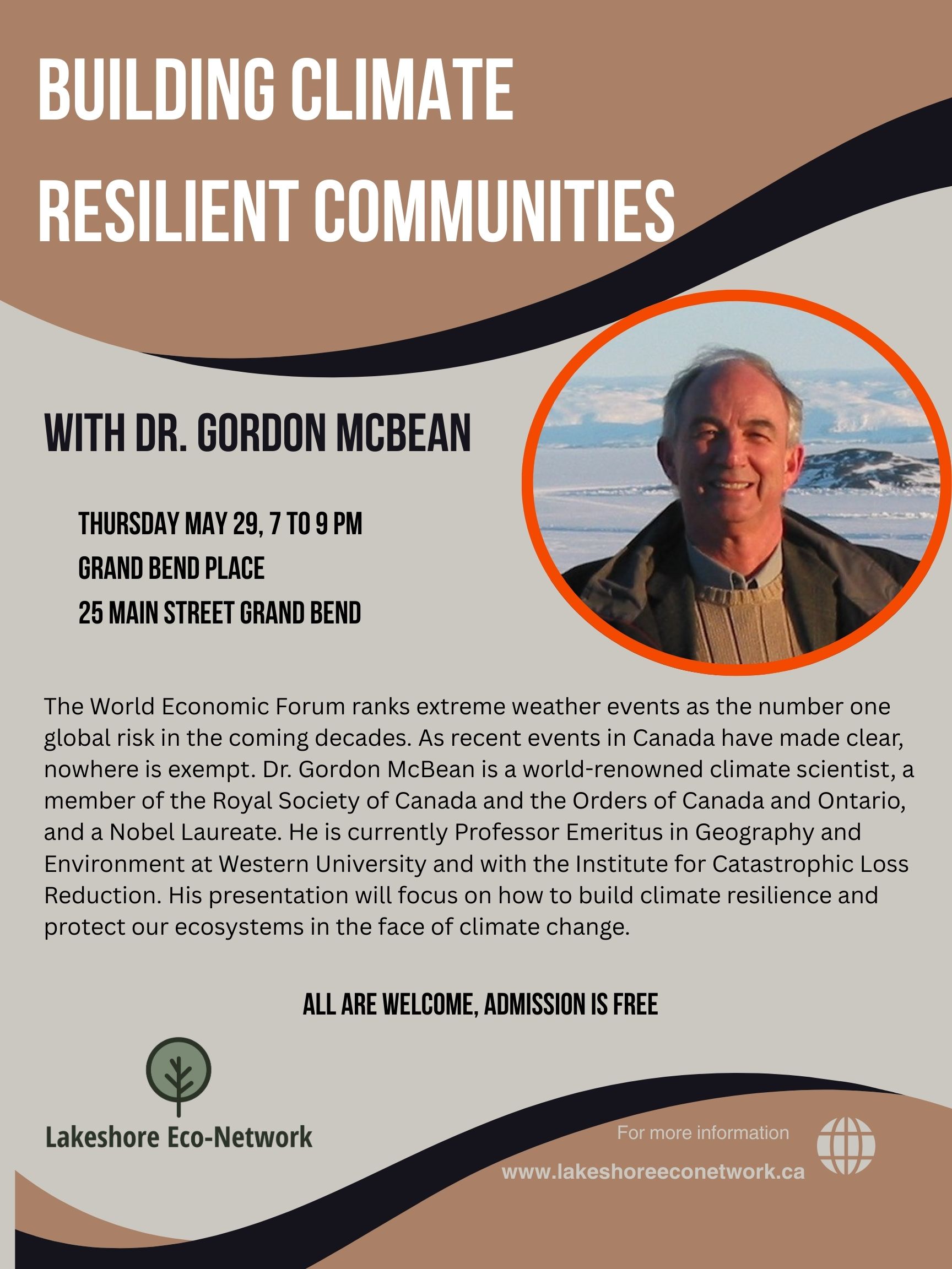Hosted by Lakeshore Eco-Newtork (LEN), Building Climate Resiient Communities with Dr. Gordon McBean, a world-renowned climate scientist. His presentation will focus on how to build climate resilience and protect our eco-systems in the face of climate change. Admission is FREE.