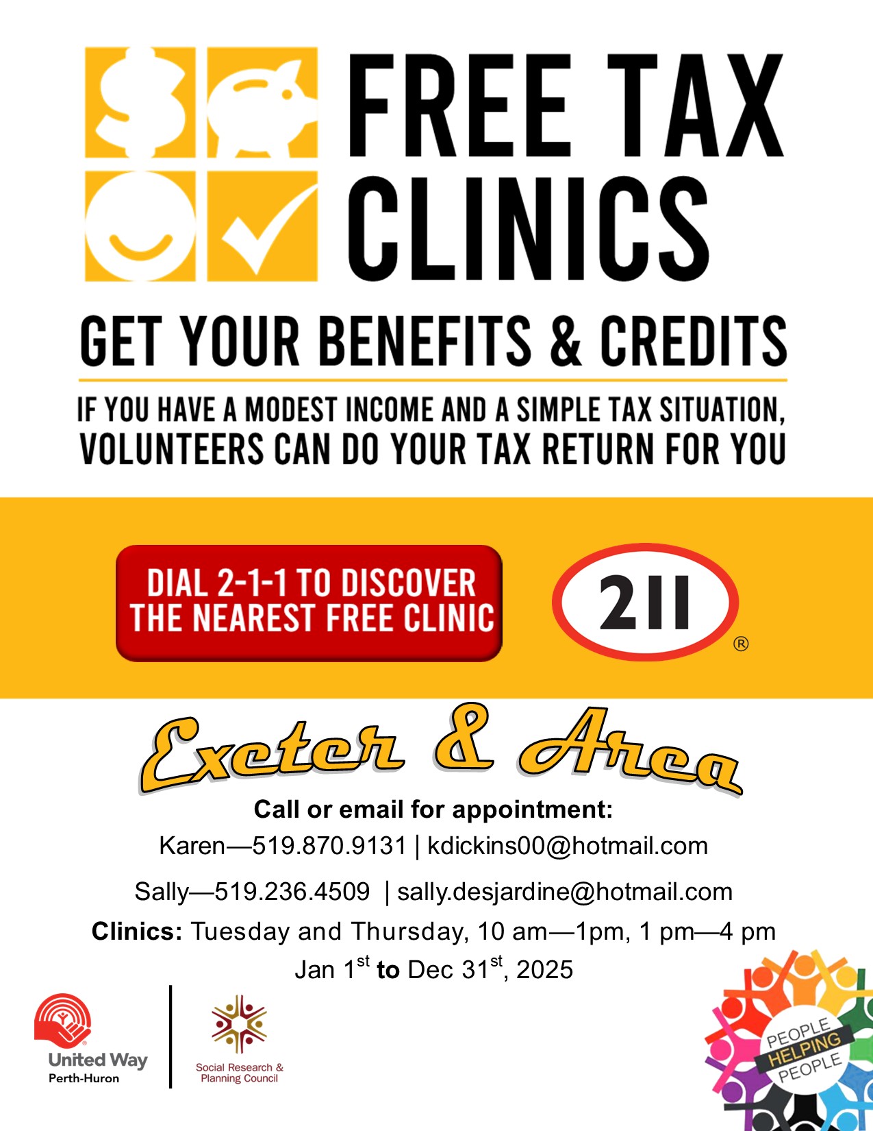 Get your benefits and credits - if you have a modest income and simple tax situation, you can get help from a trained volunteer to do your tax return for FREE. Clinic takes place at the Exeter Library (330 Main Street) on Tuesdays and Thursdays, from 10 am - 12 pm, 1 pm - 4 pm, by appointment only. Contact Karen Dickins - 519-870-9131, kdickins00@hotmail.com or Sally Desjardine - 519-236-4509, sally.desjardine@hotmail.com, to book your appointment.