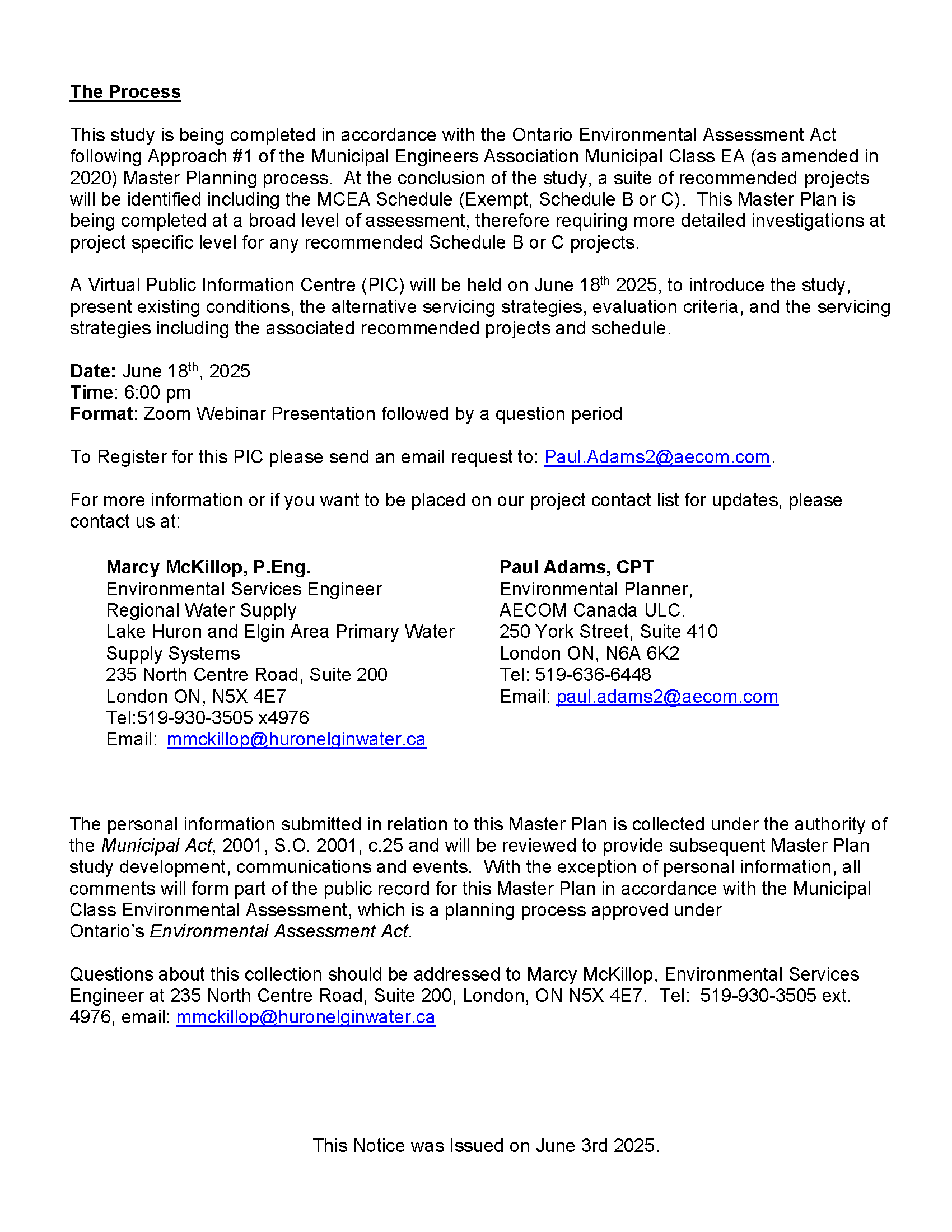 Lake Huron Primary Water Supply System Master Plan Notice of Public Information CentreContact