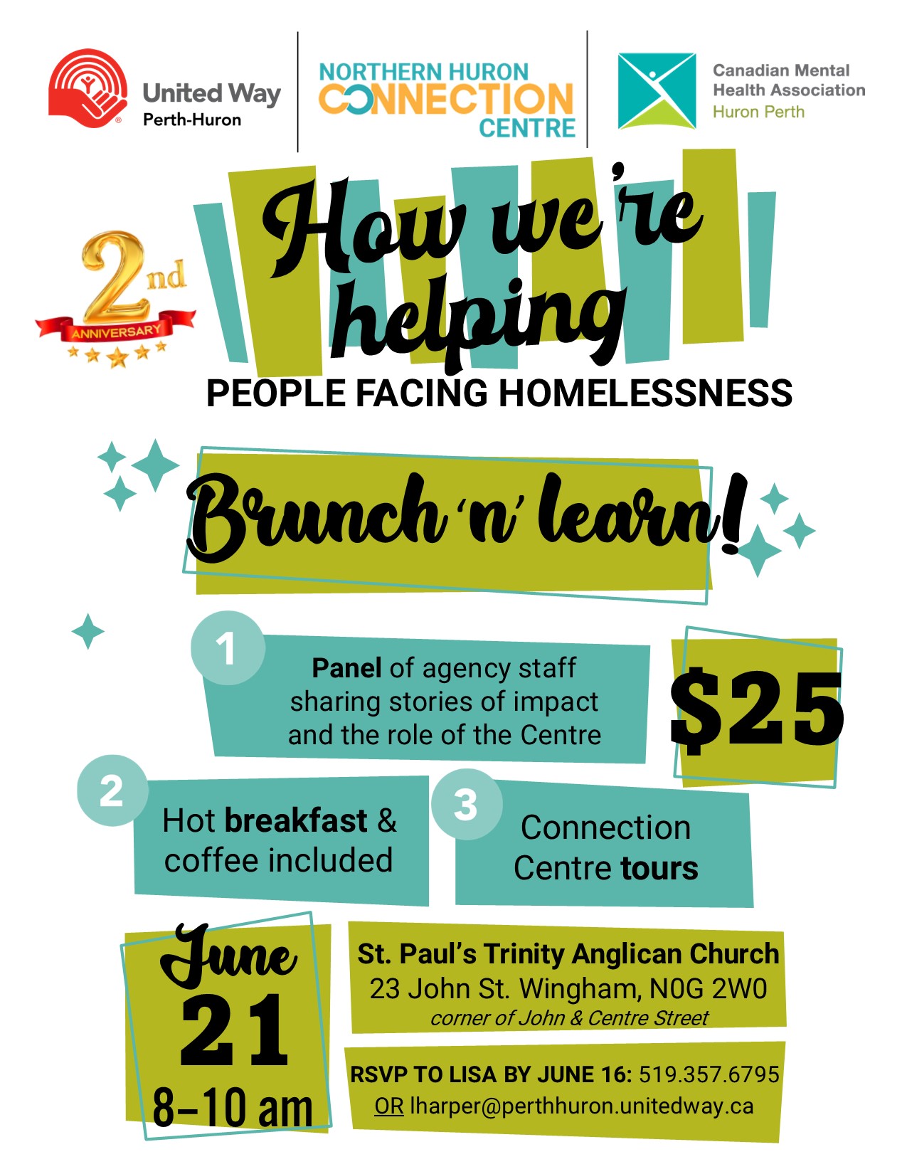 Please join us for our Brunch N' Learn Event on Saturday, June 21, 2025 at the Northern Huron Connection Centre (23 John Street, Wingham) - https://www.facebook.com/profile.php?id=61564932186592 Running from 8 am - 10 am, this event will feature a full hot breakfast and drinks, sharing of Connection Centre community role and impact. Connection Centre tours, and door prizes. Cost is $25 per person - please RSVP by June 16, 2025 to Lisa Harper - lharper@perthhuron.unitedway.ca, 519.357.6795. Everyone welcome!