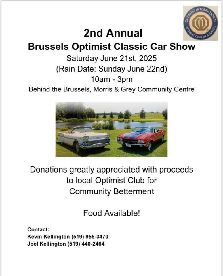 Stop by the 2nd Annual Brussels Optimist Classic Car Show! 10:00a.m. to 3:00p.m. behind the Brussels Morris Grey Community Centre. Donations accepted for community betterment projects. Food available.