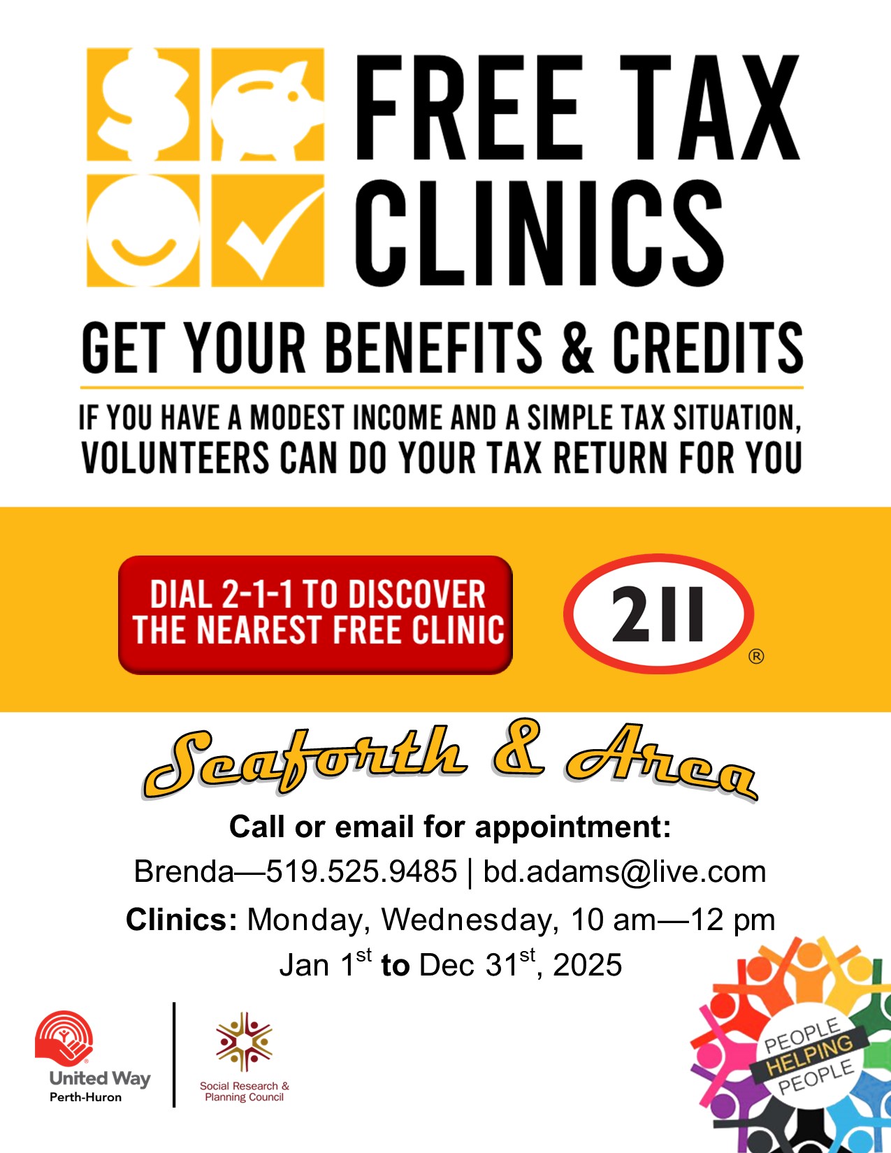 Get your benefits and credits - if you have a modest income and simple tax situation, you can get help from a trained volunteer to do your tax return for FREE. Clinic takes place at the Seaforth Library (108 Main Street, South) on Mondays, and Wednesdays, from 10 am - 12 pm, by appointment only. Contact Brenda Adams to book your appointment - 519.525.9485 or bd.adams@live.com.