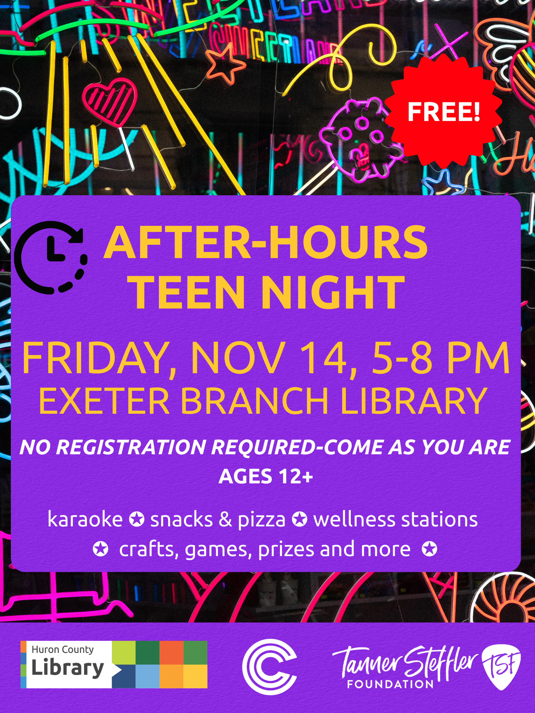 Join us at the Exeter Branch for After Hours Teen Night! On Friday, Nov. 14 and Friday, Dec. 12 the library branch is staying open late just for teens!