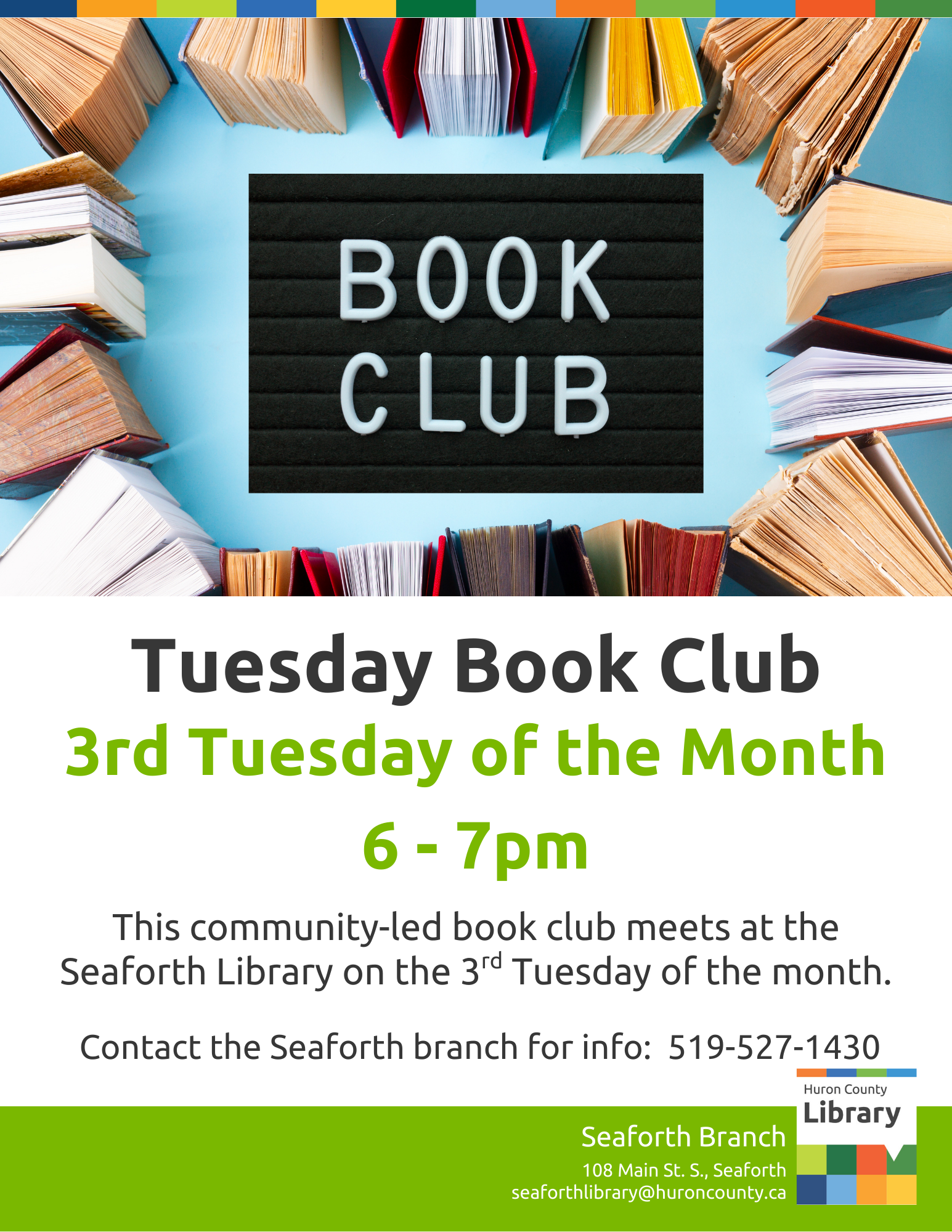 This community led book club meets at the Seaforth Library on the 3rd Tuesday of the month, from 6pm to 7pm. Everyone welcome!