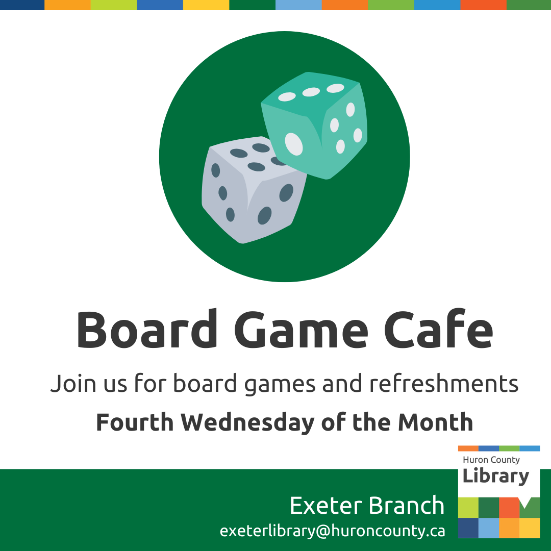 Join us at the Exeter Branch for Board Game Cafe - all ages are welcome. A variety of games will be available to try or if you have a game to introduce others to you are welcome to bring it along. Light refreshments will be provided. In partnership with the Cultural Collective. The 4th Wednesday of the month from 6:00pm to 8:00pm. This is a drop-in program, no registration is necessary