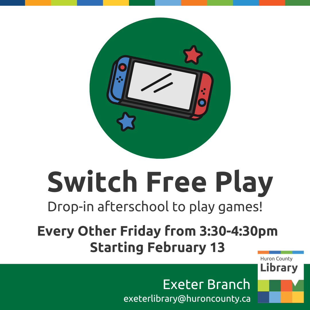 The Exeter Branch invites you to try out our Nintendo Switch! Drop-in on bi-weekly Friday afternoons to play games solo or with friends! No registration is necessary, ages 12+