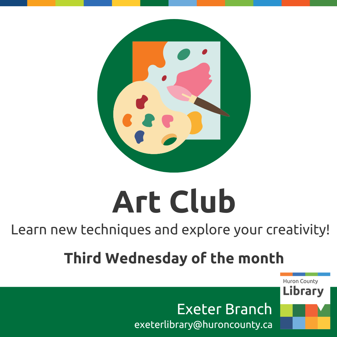Come to the Exeter Branch on every third Wednesday of the month for Art Club! We will be learning new techniques, and experimenting with different mediums every month. Art Club is a safe space to explore your creativity! Art Club is for ages 10+. This is a drop-in program, no registration is necessary.