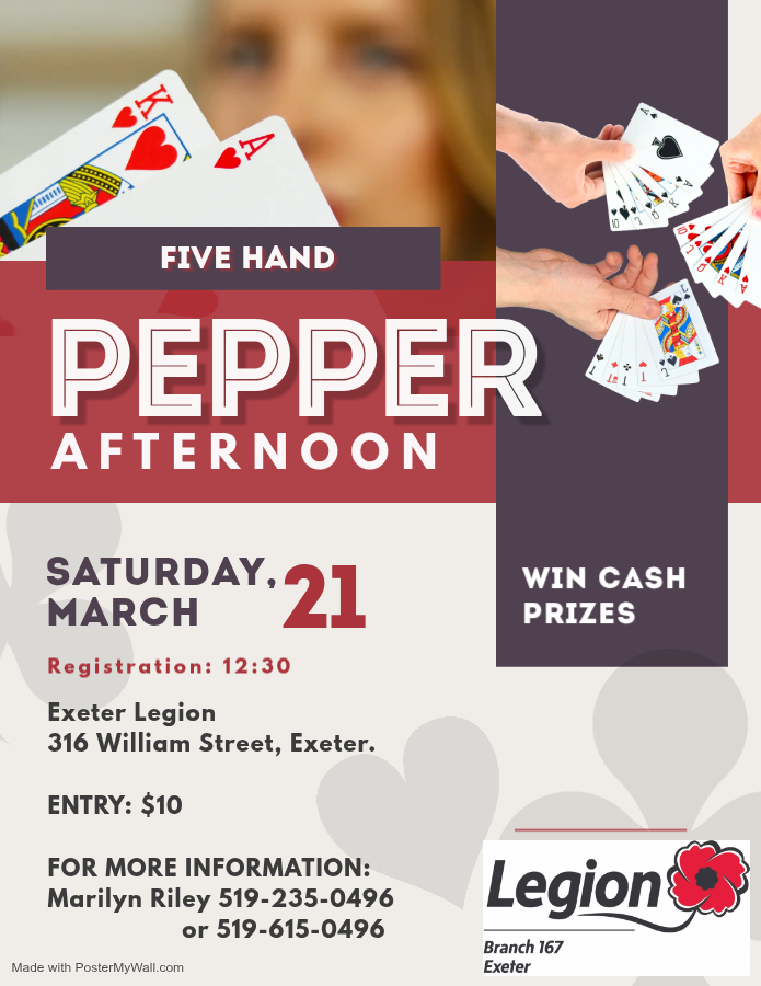 On Saturday 21 March 2026, the Exeter Legion is hosting a 5 Hand Pepper Afternoon.